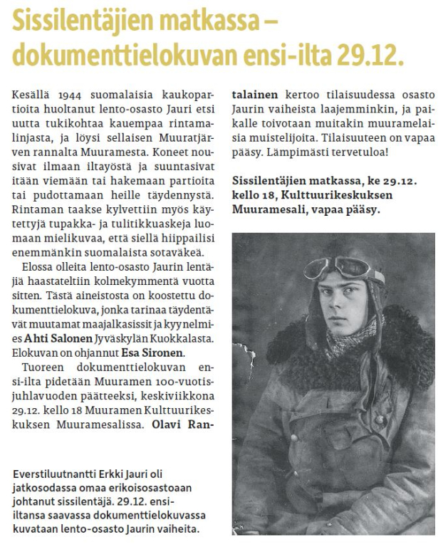 Dokumentissa partiossa olleet ja heitä Keski-Suomen Muuramesta lennättäneet osasto Jaurin lentäjät kertovat kokemuksistaan.