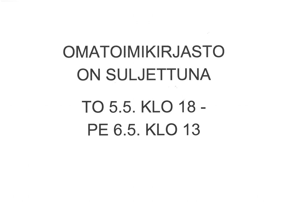Huom! Omatoimikirjasto on suljettuna to 5.5. klo 18 - pe 6.5. klo 13. Syynä sulkuun on dokumentti-ilta ja lattioiden vahaus.