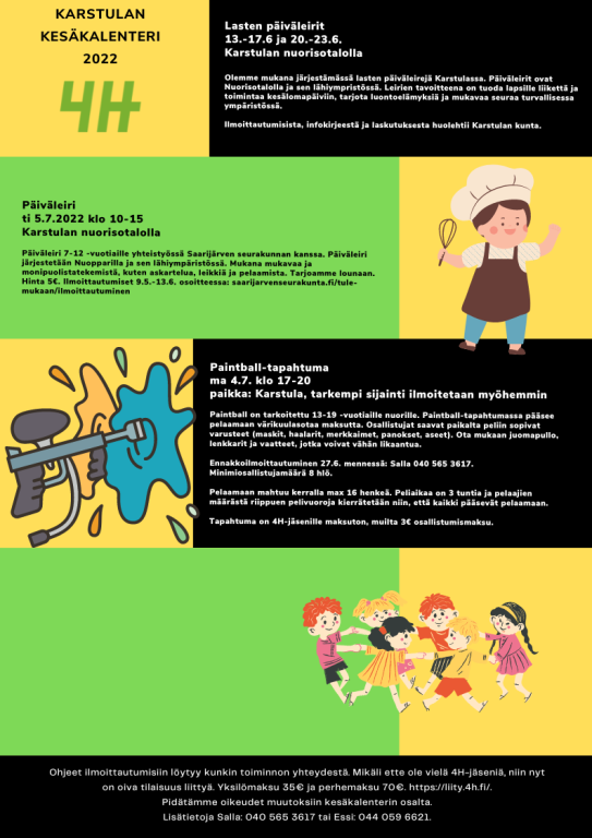 Karstulassa 4H on mukana kahdella kunnan järjestämällä lastenleirillä. Lisäksi tiedossa on yksi päivän mittainen päiväleiri yhteistyössä seurakunnan kanssa. Nuorille suunnattu Paintball-tapahtuma on loistava mahdollisuus päästä kokeilemaan värikuulasotaa omalla paikkakunnalla! Tapahtuman tarkempi sijainti ilmiotetaan myöhemmin.