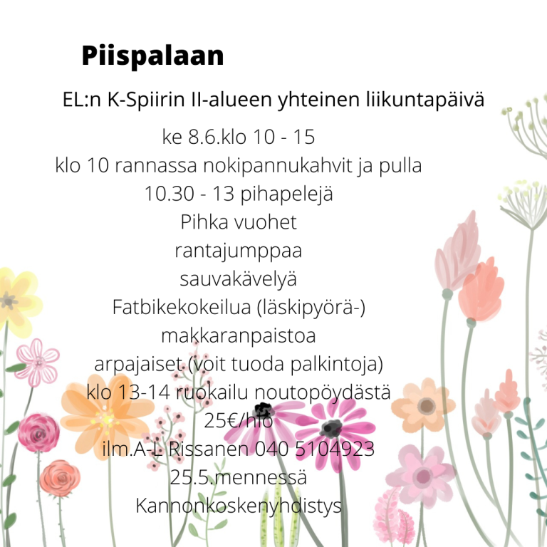 Eläkeliiton Keski-Suomen piirin II-alueen yhteinen kesän alun aktiviteettipäivä ke 8.6. Piispalassa. Päivän on järjestänyt Kannonkosken yhdistys. Mukava että joku järjestää ja nyt varmaan voimmekin jo nauttia yhdessäolosta.