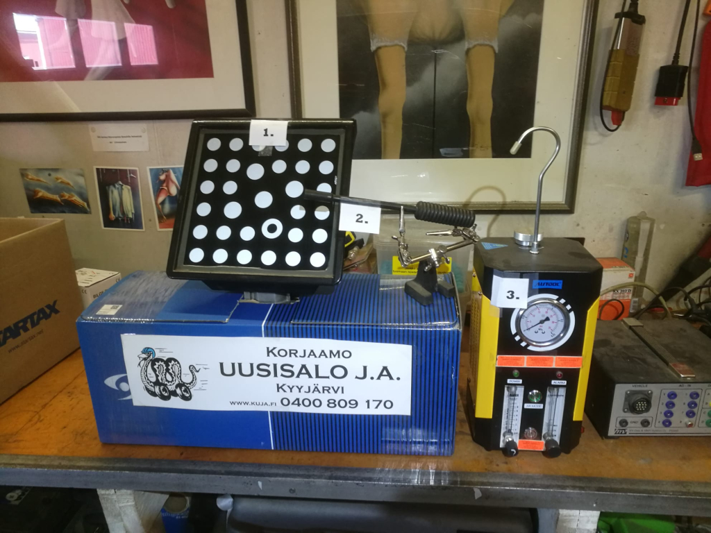 Korjaamolaitteiden nimeäminen olikin vähän hankalampaa, mutta tässäkin arpaonni suosi yhtä henkilöä (ja hänellekin on siitä ilmoitettu). Korjaamolaitteiden oikeat vastaukset olivat: 1.Pyöränsuuntauksen mittapää 2.Sytytystulpan asennustyökalu 3.Savukone vuotojen etsintään .