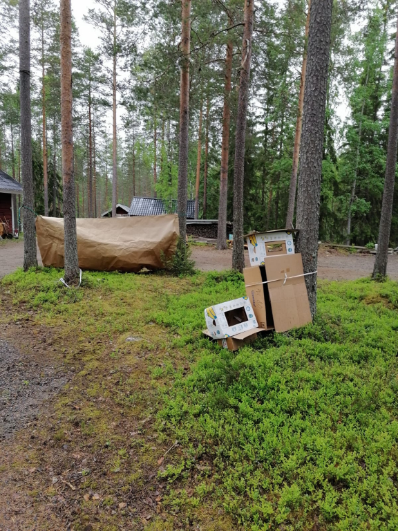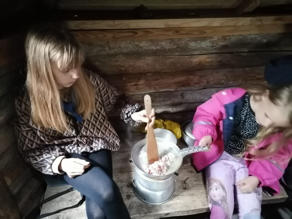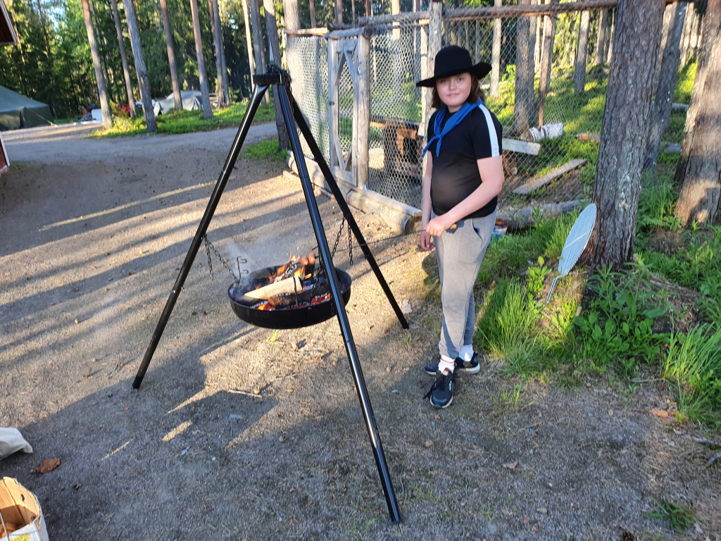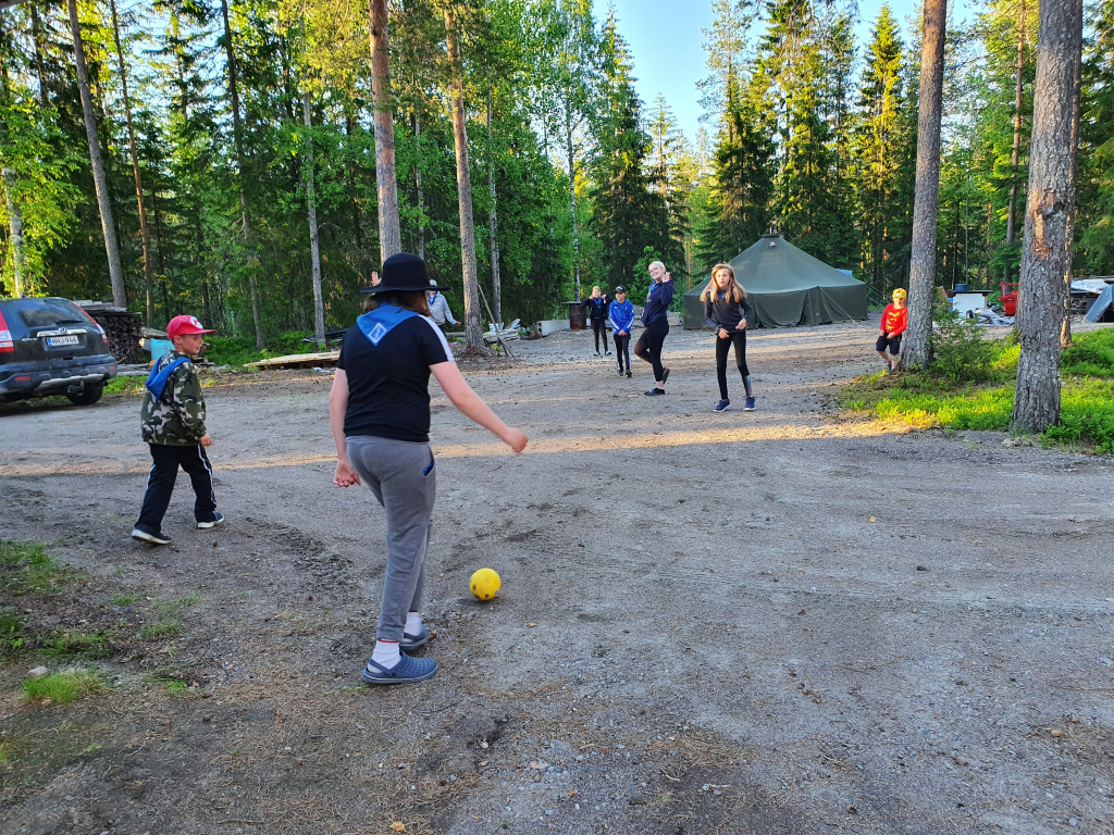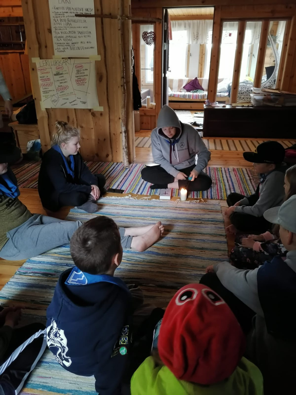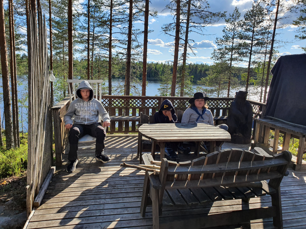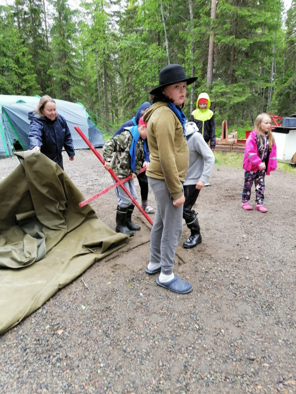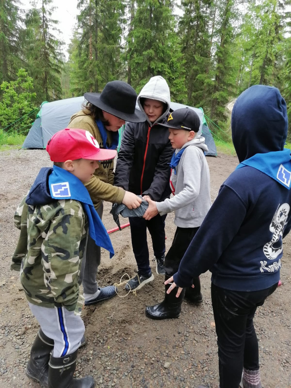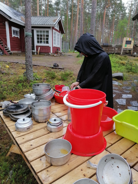 Lauantaina heräsimme ikivihreisiin sulosäveliin: “Voiko ihanammin päivän enää alkaa, onko ihanampaa aamua kuin tää…”. Marjaanan herätyspravuuri saa väkisinkin hymyn huulille, eikä kukaan voi nousta väärällä jalalla aamupuurolle. Aamupalan jälkeen jatkoimme edellisenä päivänä hyväksi havaituilla joukkueilla taistelulinnakkeiden rakentamista, sillä iltapäivällä olisi luvassa vesisotaa. Tämän jälkeen maalasimme molemmille joukkueille liput. Seuraavaksi osa jäi mökkiin pilkkomaan kasviksia, ja osa suuntasi kotaan paistamaan trangioilla pekonia sekä sipulia. Viimeksi jouduimme makaronin valmistumista trangioilla odottamaan melkoisen kauan, joten se valmistettiin mökin keittiössä. Lopuksi ainekset yhdistettiin, ja mukaan lisättiin Koskenlaskija-juustoa, mustapippuria sekä tuoretta basilikaa. Tulipa muuten melkoisen maukas mukaelma pasta carbonarasta, jonka pussiversio oli seikkailijoiden suosikki Sysilammen haikilla. Ruuan jälkeen oli luvassa vapaata aikaa mm. pelata ja piirtää. Sai myös suunnitella ohjelmaa Keskiäisiin (keskileirin juhla), jotka päätettiin myös pitää keskellä päivää. Keskiäisten jälkeen jälkeen söimme jälleen. Ruuan jälkeen päälle sai vaihtaa vesisotaan sopivan asun, ja suuntasimme linnoitustemme luokse. Vesisota-aseina käytimme vesi-ilmapalloja sekä veteen kasteltuja superlon-paloja. Peliä kokeiltiin erilaisilla säännöillä, ja välillä kävimme saunassa lämmittelemässä. Kisailun jälkeen jatkettiin saunomista ja paljuilua. Kesken saunomisen lammelta kuului jälleen huutoa. Vartija halusi tällä kertaa tietää olemmeko löytäneet rastin. Kun vastasimme kieltävästi, hän kertoi sen olevan lähempänä kuin luulemmekaan. Saunomisen lomassa pohdimme jälleen vartijan sanoja. Kaikkea sitä kuulee… Saunan jälkeen söimme iltapalaa ja kävimme nukkumaan. Isommat partiolaiset saivat jatkaa yöpymistä ulkona, mutta pienten teltta ei vesikelin vuoksi ollut kovinkaan kuiva paikka yöpyä, joten siirryimme sisälle (makuupussit olimme hakeneet evakkoon jo päivällä varmuuden vuoksi).
