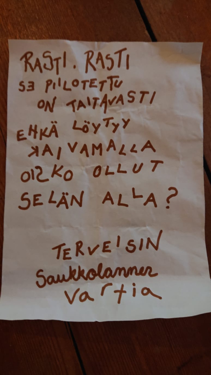 Sunnuntai alkoi jälleen tutulla herätyksellä. Yöllä useampi oli kuullut pihapiiristä ääniä, mutta kukaan ei tunnustanut liikkuneensa ulkona yöllä. Kolmijalkaiseen tulisijaamme Jimi-Kaleviin oli ilmestynyt kuitenkin lyhty, ja lyhdyn sisällä oli viesti: rasti on selän alla. Mikä voisi olla selän alla? Päivän ohjelman aloitimme leirijumalanpalveluksella eli leirijumiksella. Samoajamme kertoi meille ystävyydestä, sen tärkeydestä, sekä siitä miten paljon hän on saanut ystäviä ympäri Suomea partion kautta. Lauloimme myös partiomessulauluja. Leirijumiksen jälkeen osa siirtyi ulos huovuttamaan juomapullonpäällisiä, ja osa suunnitteli päättäjäisten ohjelmaa. Päättäjäisissä oli sketsejä, vitsejä, ja esiintyihän meille myös Matti ja Teppo -coverduo Patti ja Tuppo. Päättäjäisten jälkeen aloitimme leirin purkamisen puolijoukkueteltasta. Maavaatteen alta paljastui punainen rasti. Ei ehditty lapiota hakea kun reippaat sudenpennut kaivoivat maasta salkun, joka oli täynnä karkkia! Karkkia tosin ei vielä saanut syödä, sillä seuraavaksi söimme lähtölounaan. Lounaan jälkeen kannoimme tavarat autoihin, hyvästelimme Saukkolammen ja suuntasimme kohti kotia.