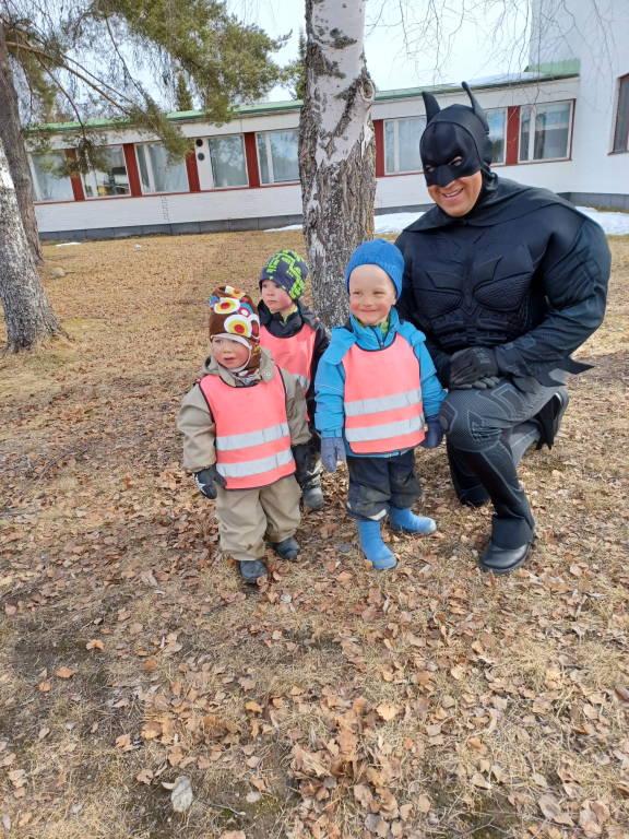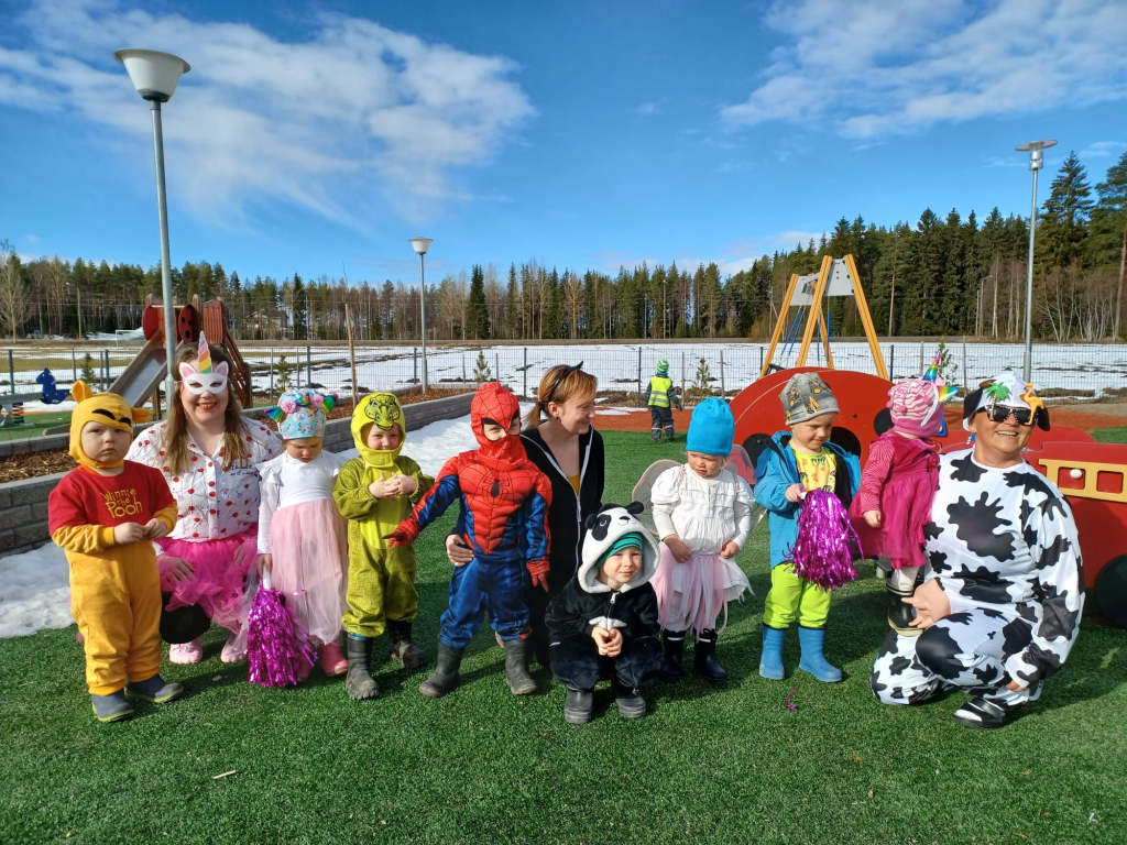 Taaperoiden kevät on ollut taas touhua täynnä. Vappuna vietimme vappujuhlia; leivottiin tähtipikkuleipiä, pomputeltiin ilmapalloja ja tietenkin pukeuduttiin naamiaisasuihin. Aidan takaa katseltiin koululaistenkin hassuja naamiasjuttuja ja Toimintapuistoon ilmestyi Batman!
