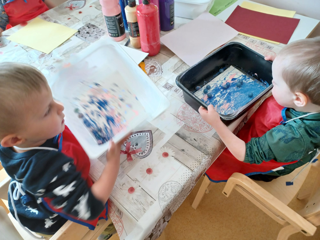 Äitienpäiväksi askarreltiin äidille taulu, maalaus ei tapahtunutkaan perinteisesti pensselillä vaan kuulilla :) Kirjastossa Maarit piti meille satuhetken joka liittyi eläimiin ja äitienpäiväkakun leivontaan.