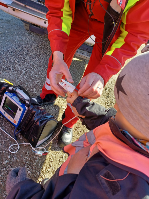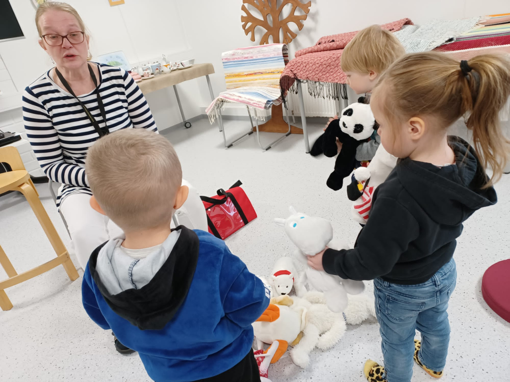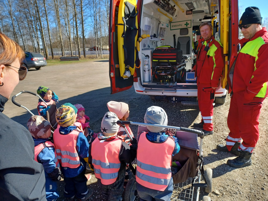 Ambulanssikin ennätti vierailulle. Oli paljon ihmeteltävää, oli monenlaista reppua ja laukkua, työkaluja, "surffilautaa"... Lopuksi lauloimme ambulanssimiehille kiitokseksi Ti-ti Nallen 112-laulun.