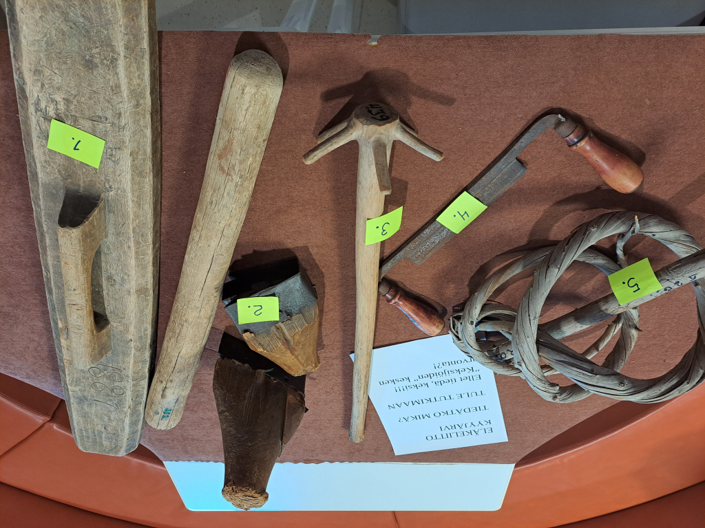 4. Puun kuorija, puuhöylä, kaulain, puukaulain, kuorimarauta, vuollin, puun parkkuurauta,taltta, puunkuorin, parkkausrauta, saha, kuorintahöylä, kuorin, kavahöylä, saha, pantaveitsi, parkkuuveitsi, petkele, hirsityökalu, tukin kuorija -- parkkirauta, vuolin, kava, kahdella kädensijalla varustettu, alkeellinen höylä. Siis pantaveitsi, joka on lahjoitettu Amerikasta.