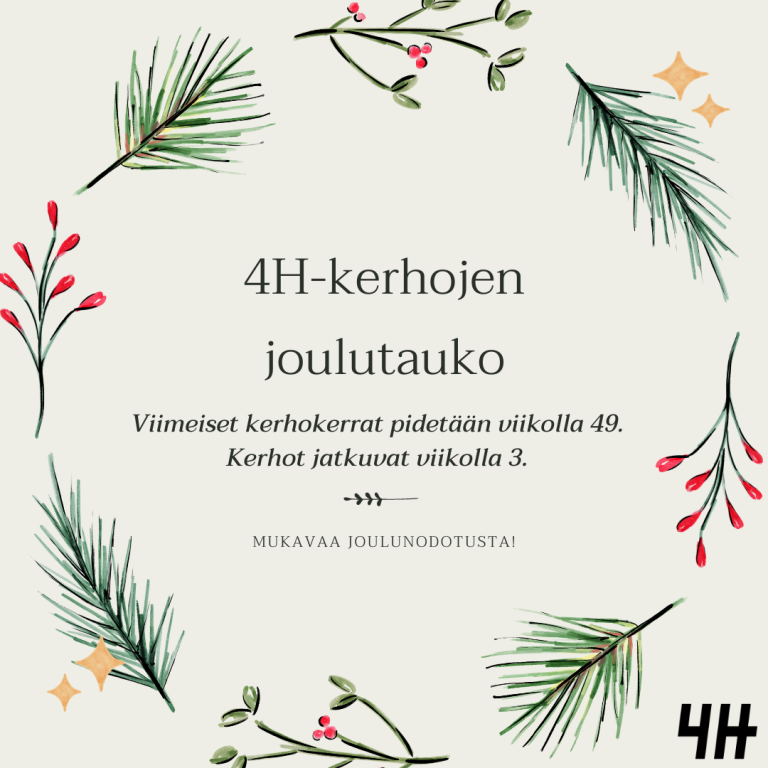 Lapset ja nuoret 29.11.2022 Karstulan-Kyyjärven 4H-yhdistys ry Essi Honkonen 4H-kerhojen joulutauko 4H-kerhojen viimeiset kerhokerrat pidetään viikolla 49. Kerhot jatkuvat tuttuun tapaan viikolla 3. Mukavaa joulunodotusta! Jaa sosiaalisessa mediassa Aihealueen yhteistyöyritykset