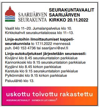 Saarijärven seurakunta on maantieteellisesti hyvin laaja koostuen Saarijärven alueesta sekä viidestä kappeliseurakunnasta Kannonkoski, Karstula, Kivijärvi, Kyyjärvi ja Pylkönmäki. On tärkeää, että päättäjiä on koko tältä alueelta, jotta edustuksellisuus toteutuu. Tämän voi taata ainoastaan äänestämällä.