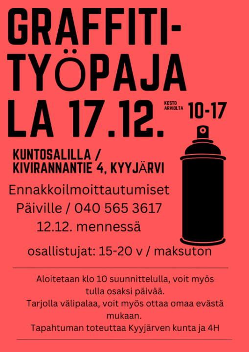 Kyyjärven kunta tarjoaa yhdessä 4H-yhdistyksen kanssa 15-20 vuotiaille nuorille mahdollisuuden kokeilla graffitien tekoa monitoimitalon kuntosalilla järjestettävässä työpajassa 17.12.2022. Työpajasta on iloa sekä nuorille että muille kuntosalin käyttäjille. Nuoret saavat kivan uuden kokemuksen ja kuntosali saa väriä senälle. Ilmoittautumiset työpajaan Päivi Hämäläiselle 12.12.2022 menenssä.