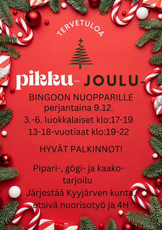 Lapset ja nuoret 08.12.2022 Karstulan-Kyyjärven 4H-yhdistys ry Essi Honkonen Pikkoujoulut nuorisotalolla Kyyjärven kunta, Etsivä nuorisotyö ja 4H järjestävät pikkujoulut nuorisotalolla pe 9.12. Luvassa mm. bingoa ja loistavat palkinnot, tervetuloa mukaan! Jaa sosiaalisessa mediassa Aihealueen yhteistyöyritykset