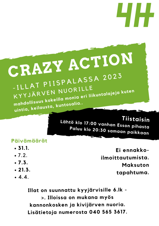 Crazy action-illat Piispalassa jatkuvat! Illat on suunnattu Kyyjärven nuorille, 6.luokkalaisille ja sitä vanhemmille.