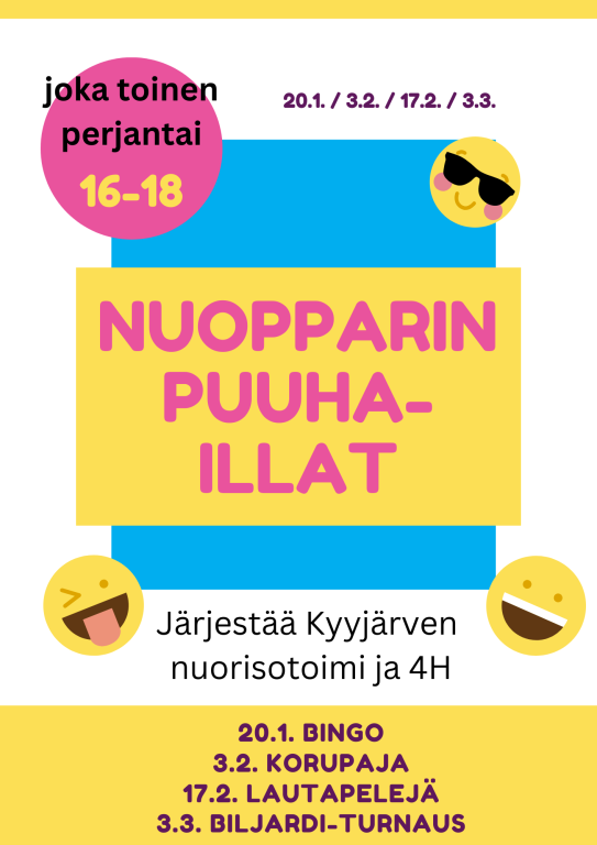 Lapset ja nuoret 18.01.2023 Karstulan-Kyyjärven 4H-yhdistys ry Päivi Heinonen Nuopparilla alkaa puuha-illat! Puuha-illat alkavat nuopparilla joka toinen perjantai klo:16-18! Tarjolla yhteistä, ohjattua tekemistä. Jaa sosiaalisessa mediassa Aihealueen yhteistyöyritykset