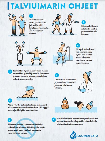 Tarvitset mukaasi: uikkarit (yhteissauna), pyyhe, tossut ja käsineet (neopreeni käsine on hyvä) ja suositeltavaa on käyttää pipoa/päähinettä.