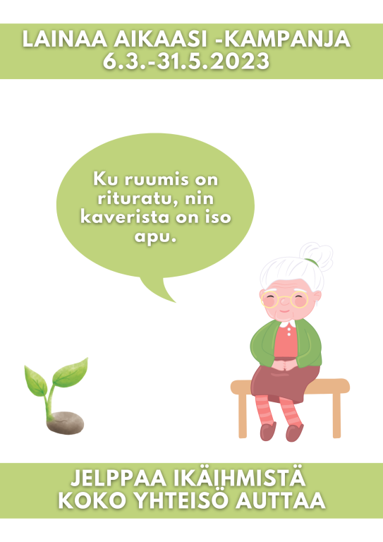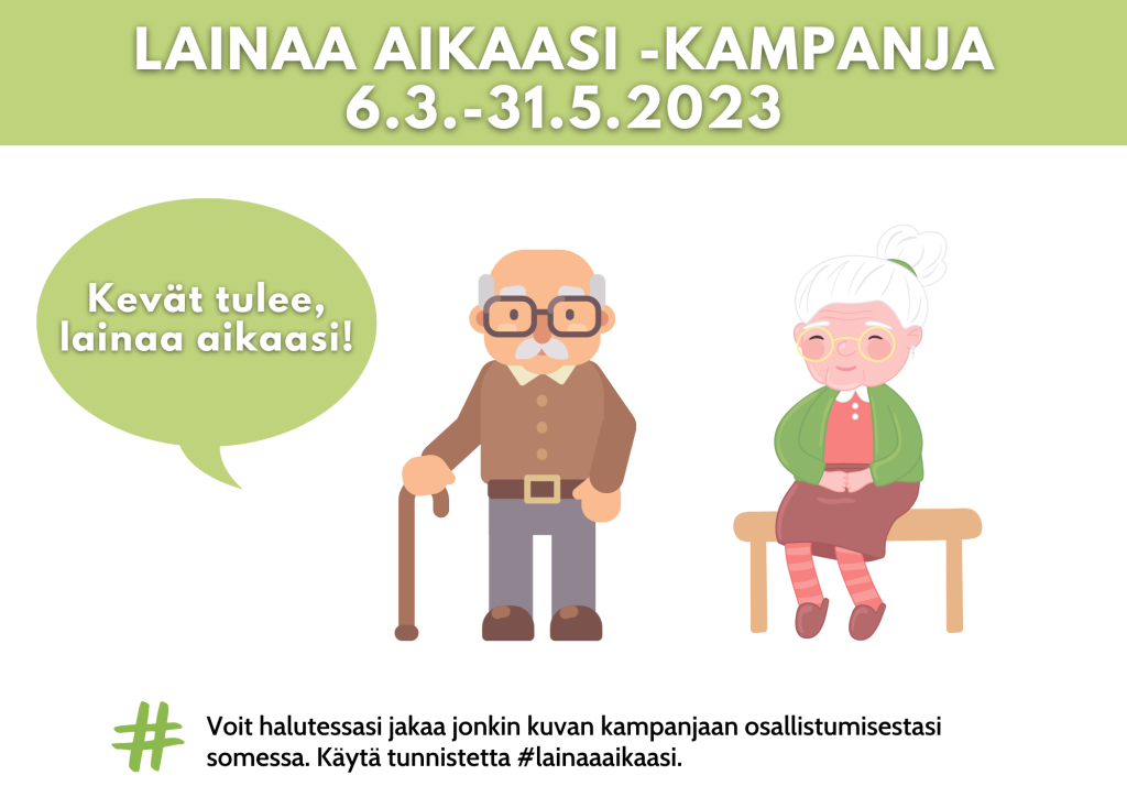 Maaliskuusta alkaen voit siis käydä lainaamassa aikaasi Kyyjärven kunnankirjastossa paikkakuntasi ikäihmisten hyvinvoinnin tukemiseksi. Lähde mukaan kampanjaan yksin tai yhdessä kaverin kanssa!