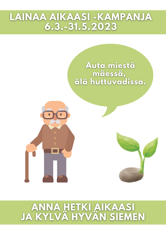 Jo pienelläkin avulla voidaan saada aikaan paljon hyvää, joten lähde siis mukaan ”Lainaa aikaasi” -kampanjaan, joka toteutetaan Kyyjärvellä 6.3.-31.5.2023 välisenä aikana.