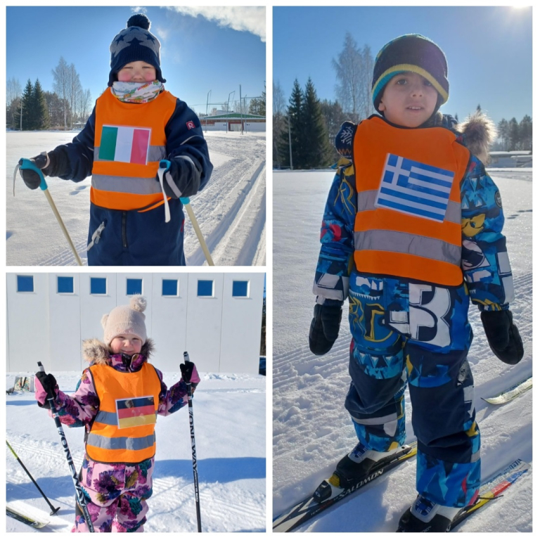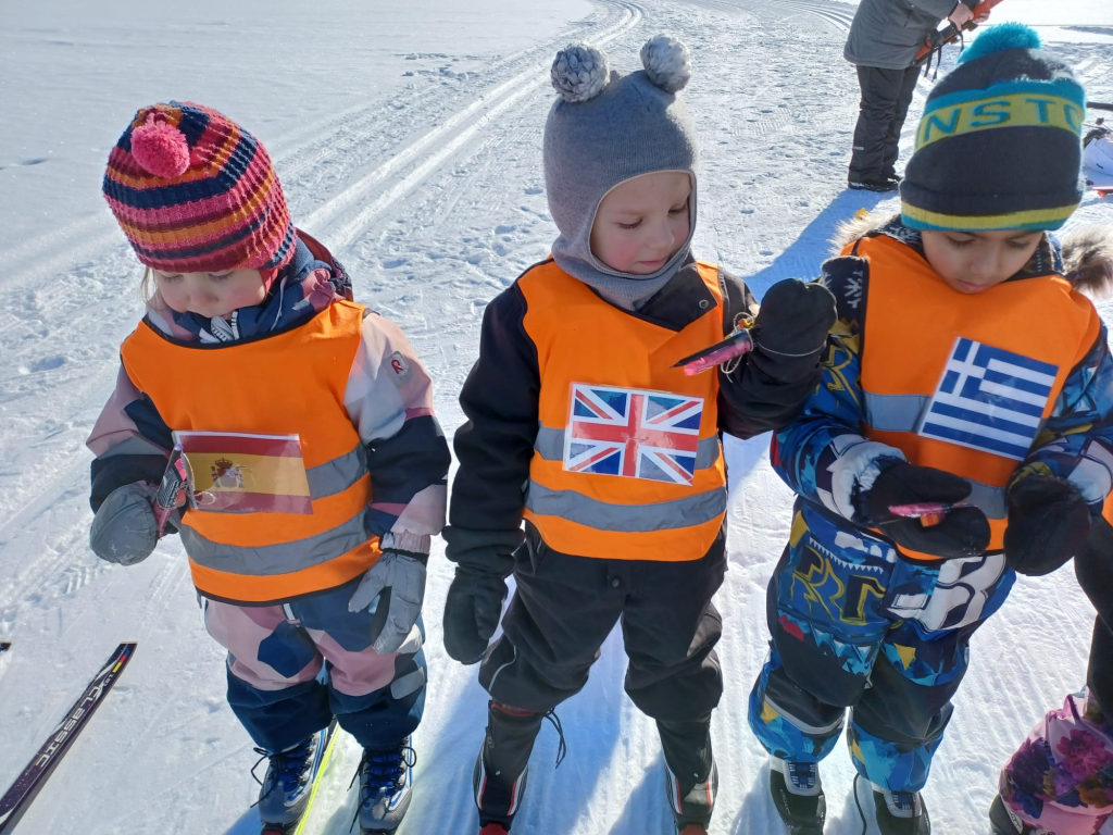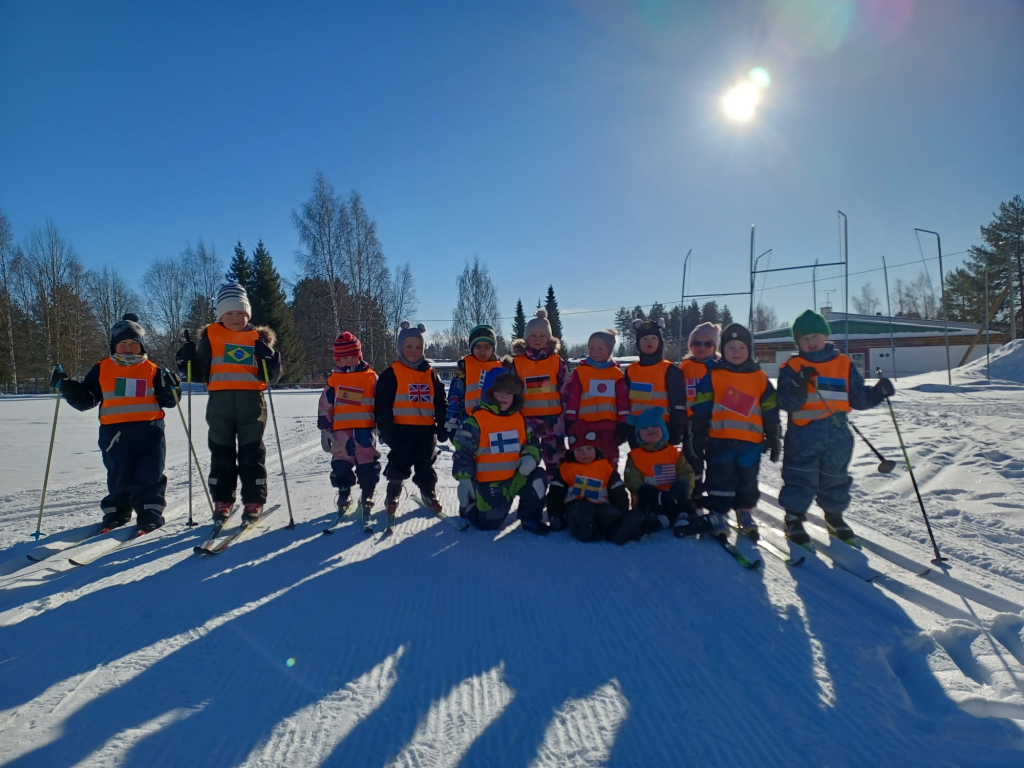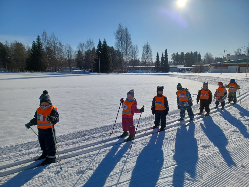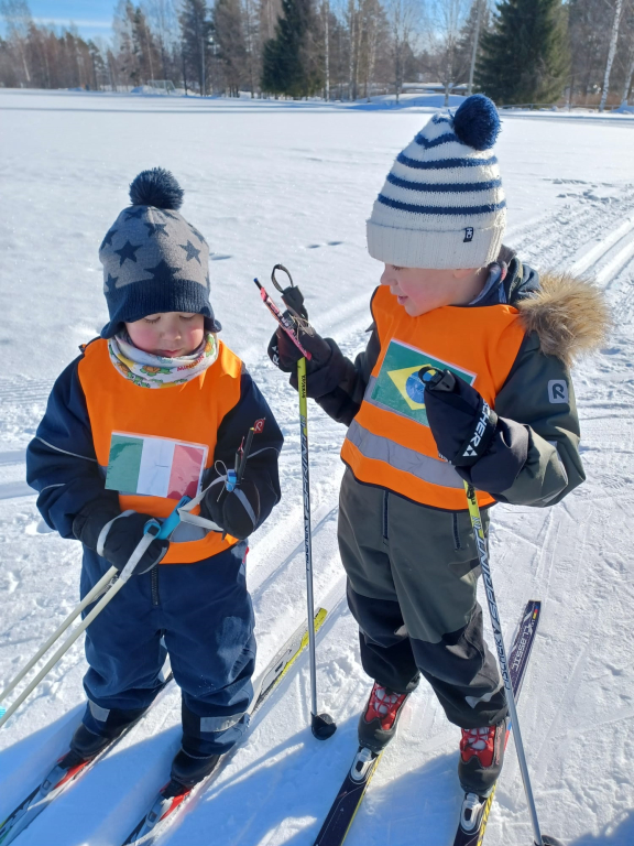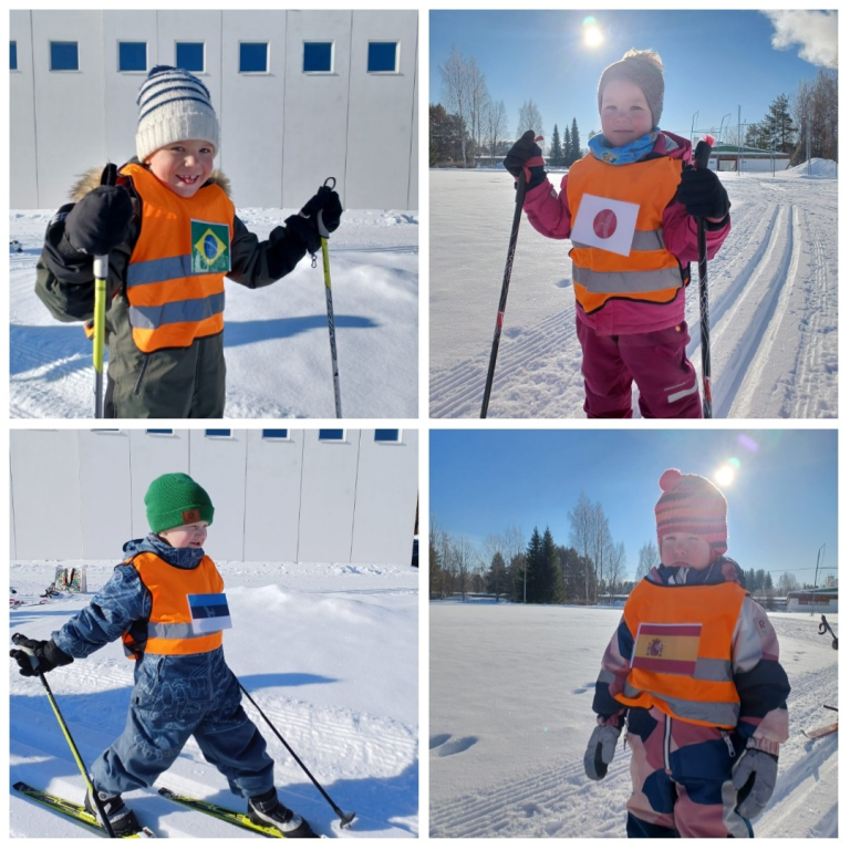 3-5 -vuotiaiden Tenavien ryhmässä pidettiin tänään hiihdon maailmanmestaruuskilpailut! Yhteislähtöön osallistui 14 eri maan edustajaa. Tässä kilpailussa kaikki olivat voittajia ja kaikki tietysti myös palkittiin! Aamulla aikaisin pakkasta oli jopa -28 astetta. Aurinko onneksi lämmitti ja pakkanen alkoi hellittää niin, että päästiin ladulle! Ja olipa kyllä mahtava hiihtosää!