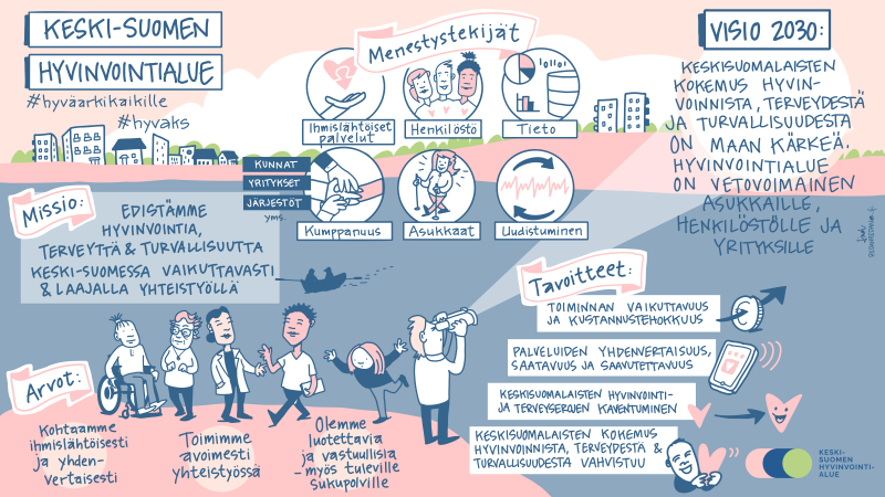 Keski-Suomen hyvinvointialueen arvot: ihmislähtöisyys, yhdenvertaisuus, yhteistyö, luotettavuus ja vastuullisuus.