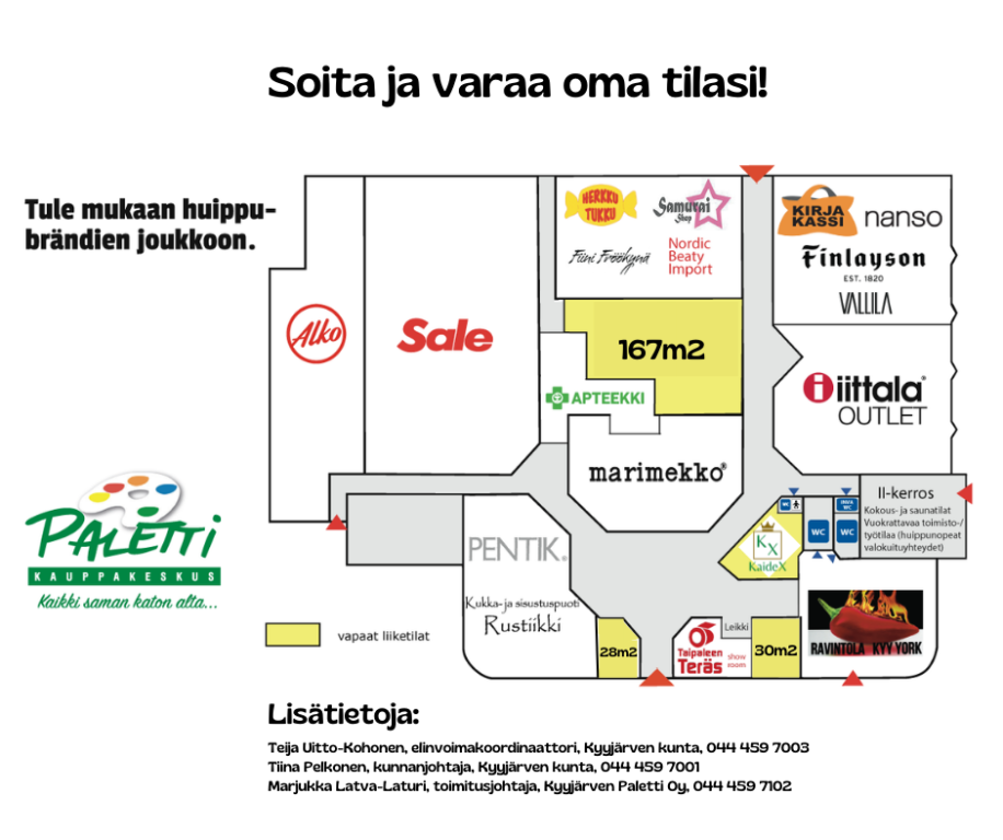 Paletissa on tällä hetkellä vapaana 167m2, 30m2 ja 28m2 liiketilat. Tilat soveltuvat mainiosti myymälöiksi. Pienemmät taipuvat hyvin myös Showroomeiksi, toimistoiksi tai vaikkapa kauneushoitolaksi/kampaamoksi. Myös kahvilapalveluita kaivataan Palettiin.