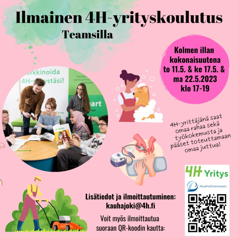 4H-yrityskoulutuksen (1op) voi suorittaa myös itsenäisesti verkossa milloin tahansa itsellesi sopii. Omatoimiseen yrityskoulutukseen pääset tästä linkistä.