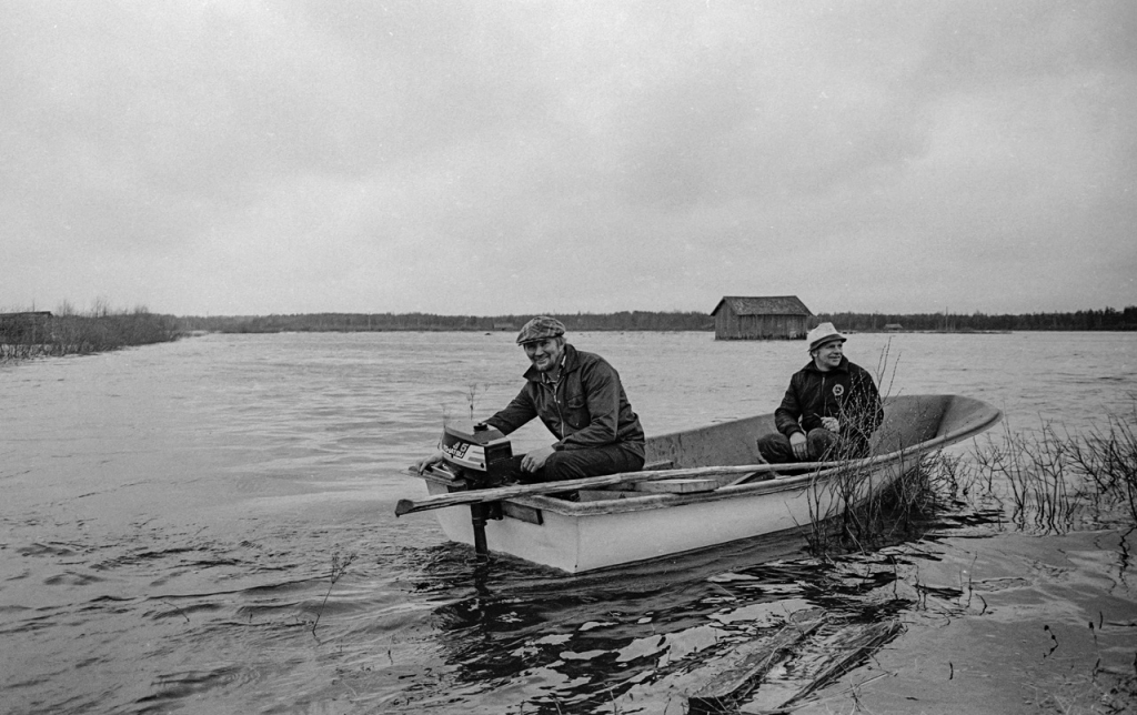 Pölkin Mikko kävelyttää koiraa ja Jääskeläisen Jukka haravoi roskia vedessä.