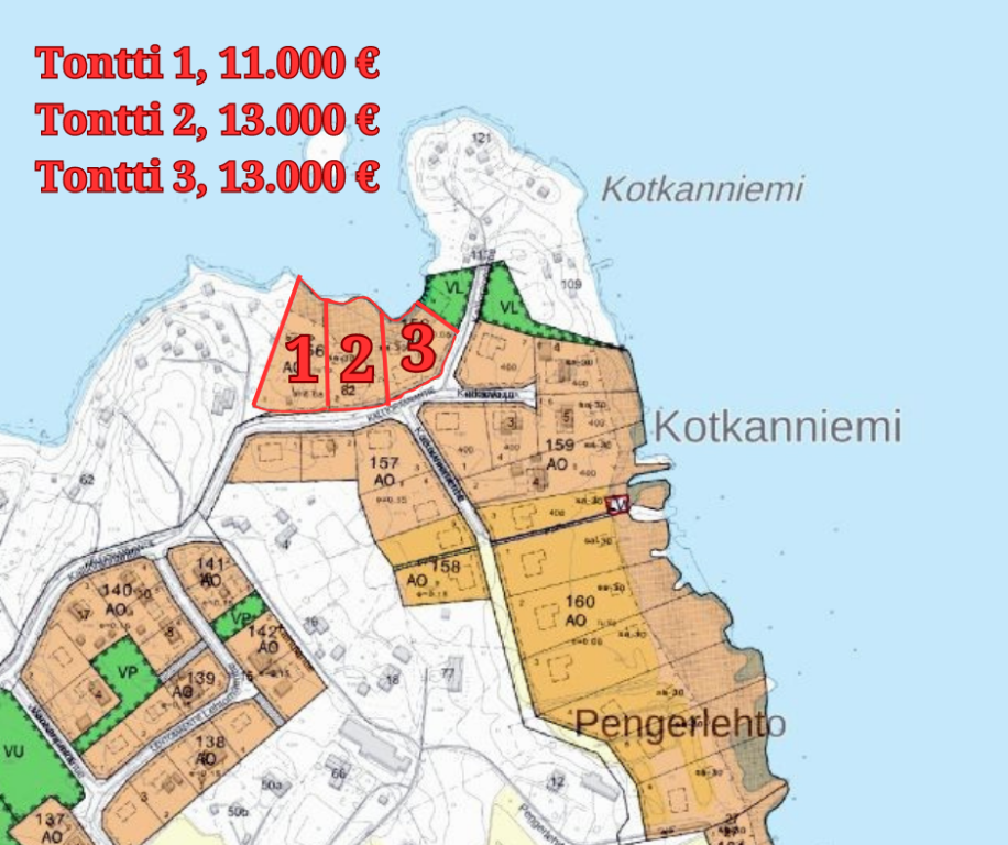 Tontti 2, myyntihinta 13.000 €, pinta-ala noin 4400 m2, rantaviivaa noin 40-50 m