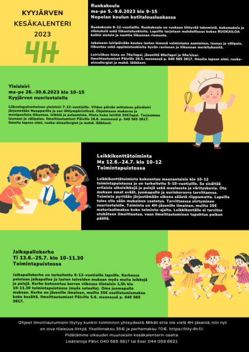 Leikkikenttätoiminta kokoontuu maanantaisin klo 10-12 toimintapuistossa ja on tarkoitettu 5-10-vuotiaille. Se sisältää erilaisia ulkoleikkejä ja pelejä sekä maalausta ja värityskuvia. Ota mukaan omat eväät, juomapullo ja aurinkorasva tarvittaessa. Toiminta pyritään järjestämään ulkona säästä riippumatta. Lapsilla tulee olla sään mukainen vaatetus. Tarvittaessa siirtyminen nuorisotalolle. Toiminta on 4H-jäsenille ilmainen, muilta 35€ materiaalimaksu koko toiminta-ajalta. Leikkikentälle ei tarvitse etukäteen ilmoittautua, vaan ilmoittautuminen tapahtuu paikan päällä.