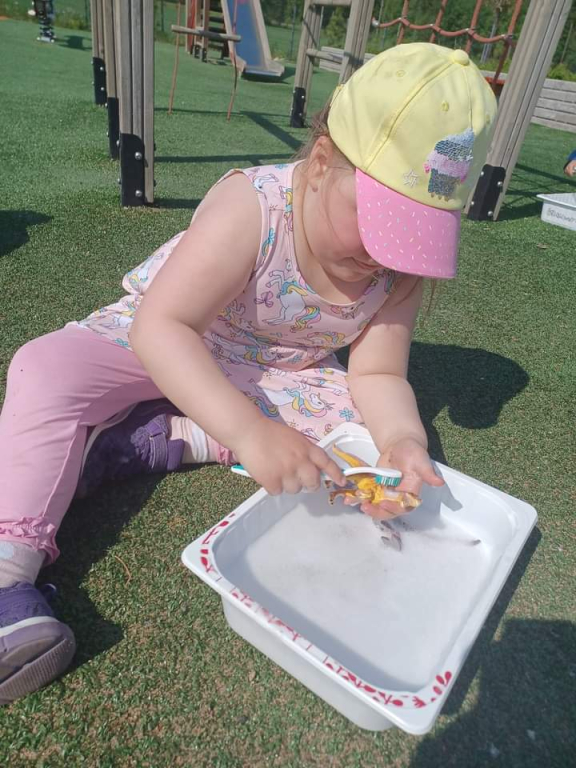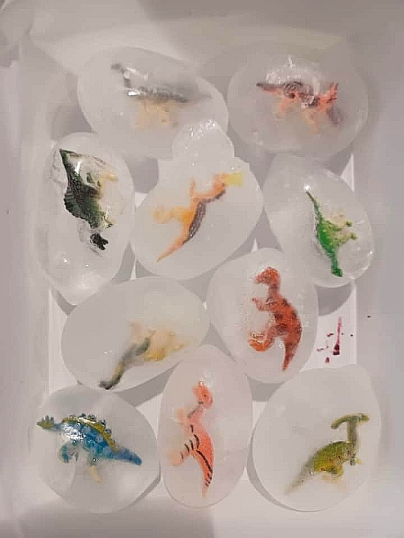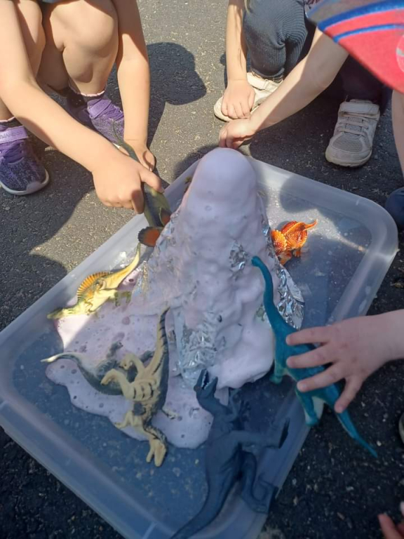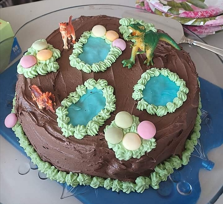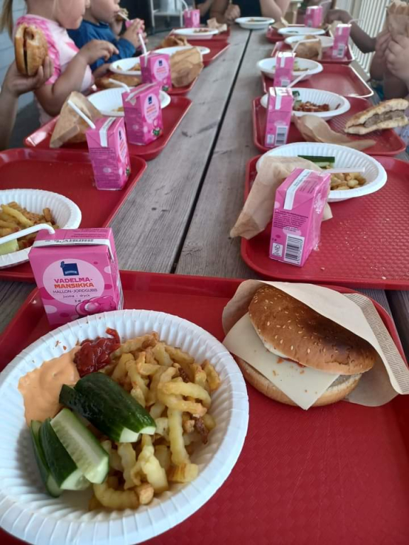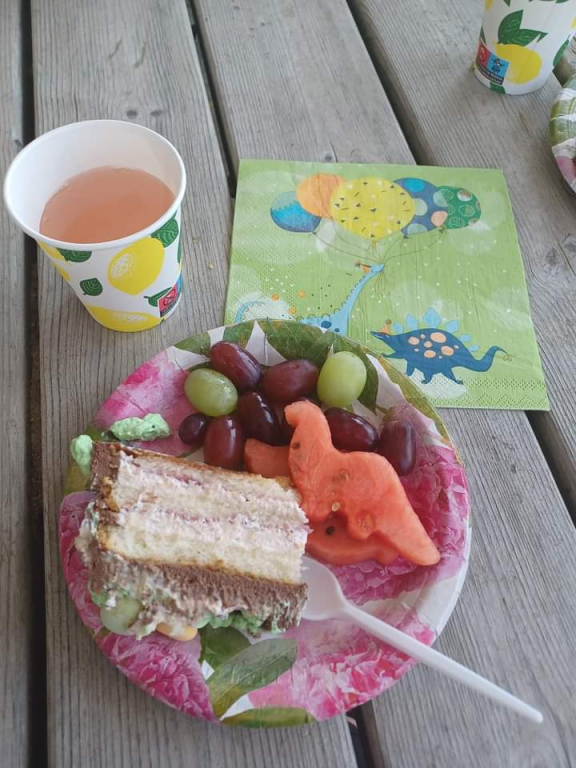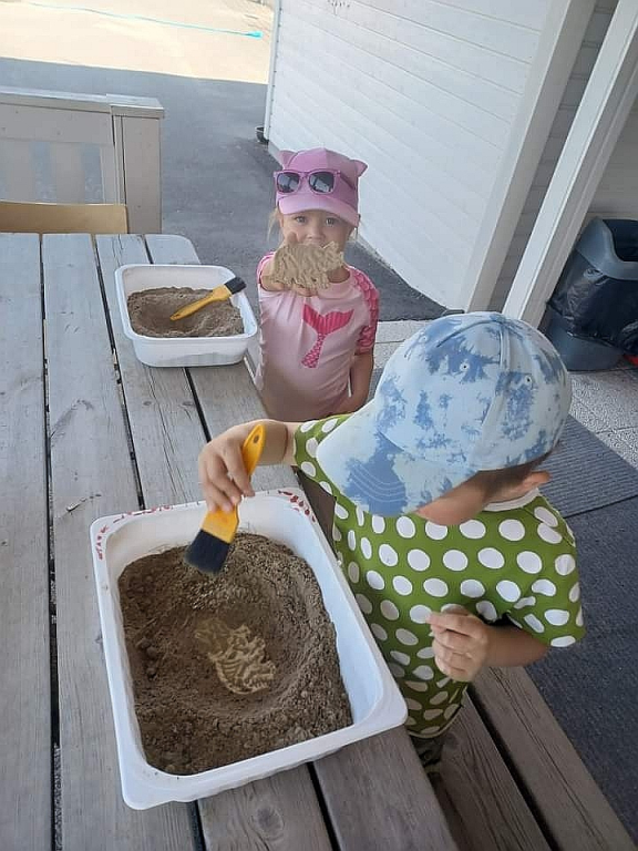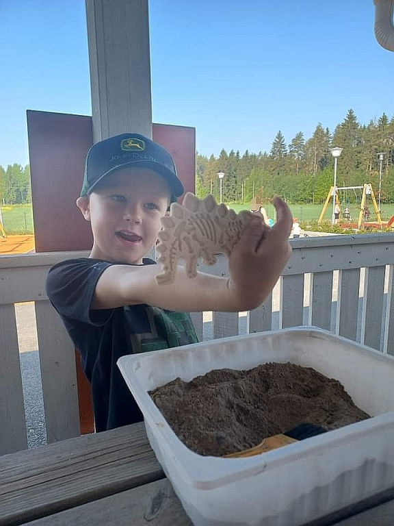 Aamulla koristeltiin vanhan päiväkodin terassi juhlia varten. Hiekka-astioista etsittiin pensselin avulla dinosaurusten luurankoja. Tässä hommassa piti olla varovainen, jotta vanhat luut eivät särkyisi. Ennen ruokaa räjäytimme kaksi tulivuorta. Sen jälkeen laavan alle jääneet dinot kaipasivatkin pesua. Dinot pääsivät vaahtokylpyyn ja lapset harjasivat hammasharjoilla ne puhtaiksi. Lounaaksi grillattiin terassilla hampurilaiset ja keittiöltä oli tilattu siihen kylkeen ranskalaiset ja kurkkutikut. Välipalaa varten teimme edellisenä päivänä lasten kanssa dinosauruskakun! Keittiön naiset taiteilivat välipalalle myös dinosauruksen muotoisia vesimelonipaloja ja viinirypäleet olivat leikisti dinon munia.