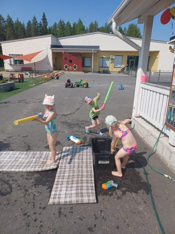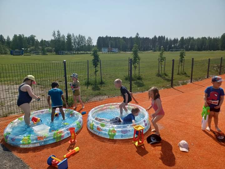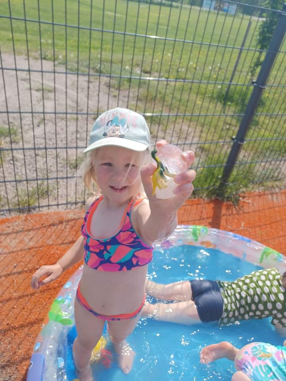 Herkuttelun jälkeen alkoi vesileikit! Täytimme pihaan kaksi lasten uima-allasta, joissa kävikin sitten helteen vuoksi melkoinen vilske! Kavereita sai ampua vesipyssyillä ja suihkepulloilla! Olimme aiemmin jäädyttäneet vesi-ilmapallojen sisään pieniä dinoja. Nyt jäätyneitä dinoja sulateltiin vesipyssyillä sekä uima-altaissa.