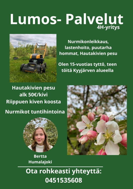 4H-yrittäjä Bertta Humalajoki tarjoaa palveluitaan Kyyjärvellä. Saatavilla nurmikonleikkausta, apua puutarhahommiin, hautakivien pesua ja lastenhoitoa.