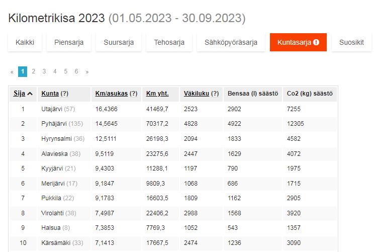 Kuntasarjassa olemme sijalla viisi (5) ja poljettuja kilometrejä huikeat 11 288 (tulos 2.7. klo 21.30).