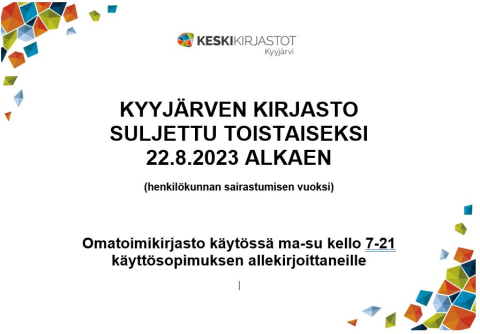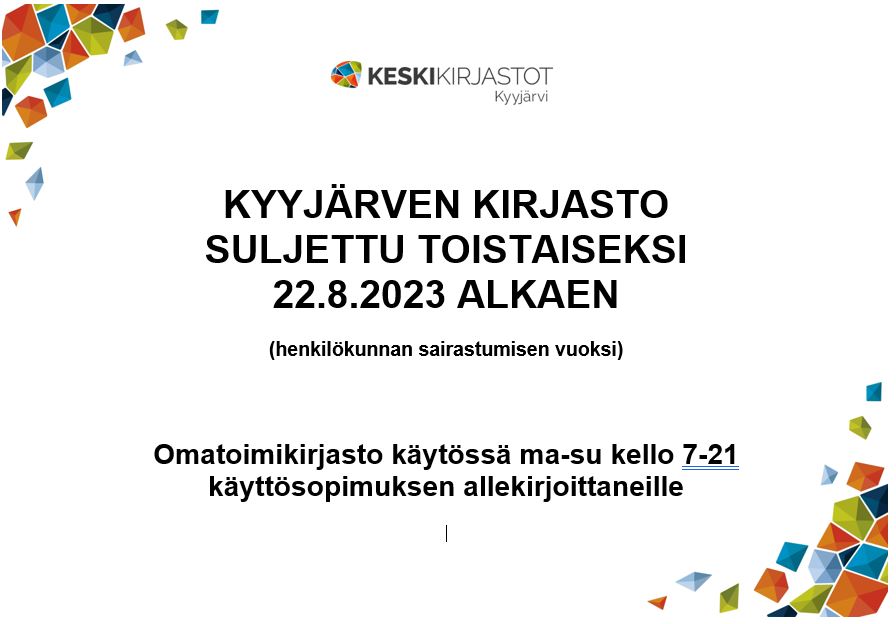 Kulttuuri 22.08.2023 Kyyjärven kunta Maarit Ohranen Kirjasto suljettuna tänään 22.8. Vaitettavasti joudumme sulkemaan kirjaston ovet tilapäisesti. Ilmoittelemme, kun ovet avautuvat jälleen. Jaa sosiaalisessa mediassa Aihealueen yhteistyöyritykset
