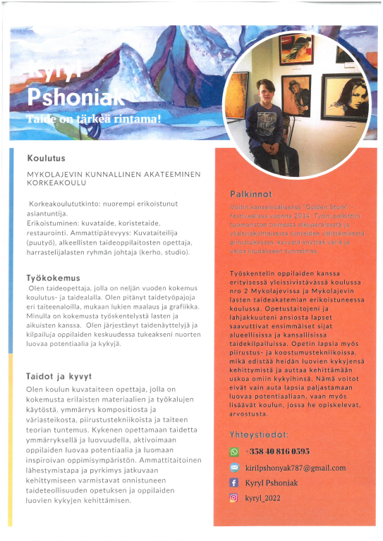 Kyryl on ukrainalainen kuvataiteilija, joka joutui pakenemaa sotaa kotimaastaan. Hän asuu tällä hetkellä Karstulassa ja opiskelee Suomen kieltä Karstulan evankelisella opistolla.