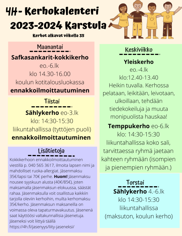 Kerhot pysyvät melko samoina viime lukuvuoteen nähden. Karstulassa uutena kerhona alkaa yleiskerho keskiviikkoisin Heikin tuvan tiloissa! Kerhossa leikitään, pelataan, ulkoillaan, leivotaan, tehdään tiedekokeiluja ja muuta hauskaa puuhaa!
