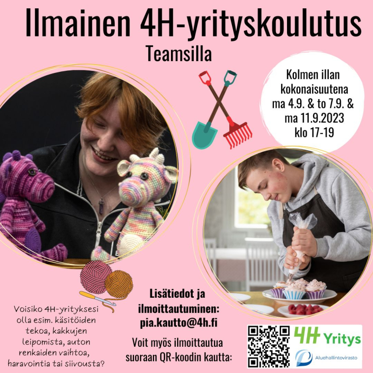 Jos yrittäjyys kiinnostaa, niin kannattaa ilmoittautua seuraavaan maksuttomaan 4H-yrityskoulutukseen, joka järjestetään teamsin kautta syyskuussa.