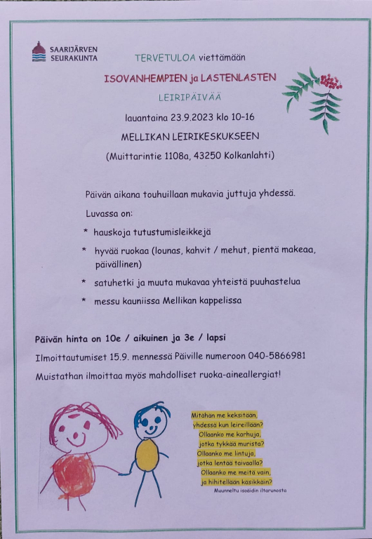 Lämpimästi tervetuloa isovanhempien ja lastenlasten leiripäivään launantaina 23.9.2023 Mellikan leirikeskukseen.