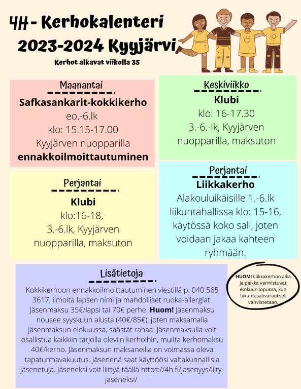 Kerhotoiminta on alkanut tällä viikolla ja perjantaina vielä luvassa liikkakerho 1.-6. luokkalaisille liikkasalissa klo 15-16. Liikuntasalivuorot on nyt vahvistettu ja kerho pidetään aiemmin ilmoitettuna aikana.
