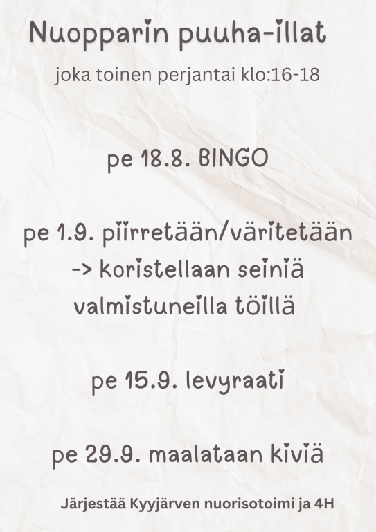 3.-6. luokkalaisten klubi järjestetään nuorisotalolla keskiviikkoisin klo 16-17.30 ja perjantaisin 16-18. Klubillekin mahtuu vielä hyvin porukkaa! Nuopparilla voi lukea, piirtää, pelata tai mitä vain muuta hauskaa muiden lasten ja ohjaajan kanssa. Joka toinen perjantai parittomilla viikoilla on luvassa puuhailtoja, joissa on jotain hauskaa lisäohjelmaa tiedossa. Klubi-iltapäivät ovat maksuttomia.