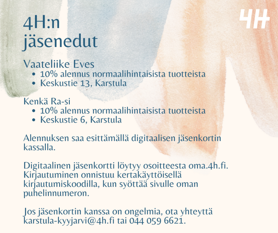 Jos jäsenkortin kanssa on ongelmia, ota yhteyttä karstula-kyyjarvi@4h.fi tai 044 059 6621.