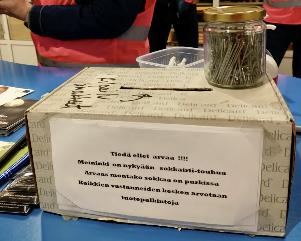 Paikalla oli myös arvontaa eli montako sokkaa oli pienessä purkissa. Kaikkien vastanneiden kesken arvottiin palkinto ja oikein vastanneet (joita oli 2) saivat myös palkinnot. Oikea vastaus oli 200 sokkaa. (Palkituille on voitosta ilmoitettu.)