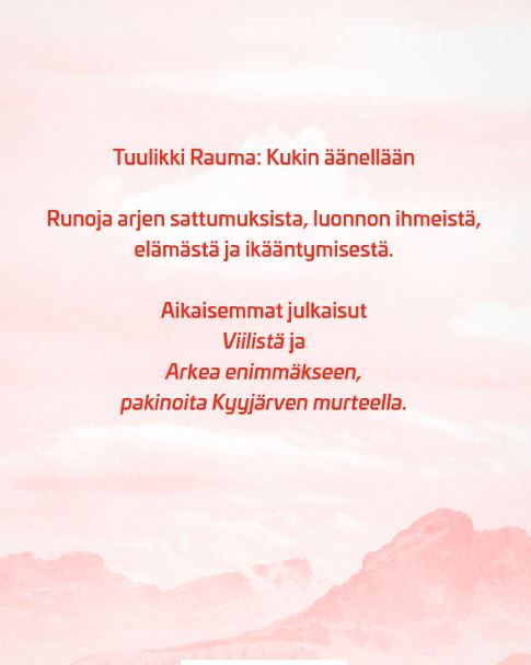 Kyyjärveltä kotoisin oleva Tuulikki Rauma (o.s. Lehtola) on tullut tutuksi ennen kaikkea murrepakinoistaan. Pakinoita on julkaistu lehdissä ja niitä olemme päässeet kuulemaan eri tilaisuuksissa. Vuonna 2019 Tuulikki julkaisi ensimmäisen kirjansa Viilistä: pakinoita Kyyjärven murteella. Tämä kirja taltioi hienosti sekä Kyyjärven murretta että arkielämää Tuulikin lapsuuden ja nuoruuden vuosilta.