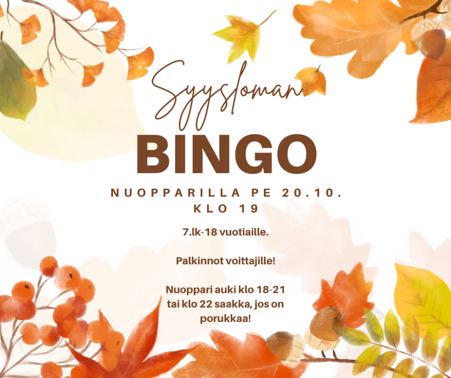 Syysloman kunniaksi pelataan bingoa perjantaina 20.10. klo 19.00. Bingo on tarkoitettu 7.lk-18 vuotiaille.