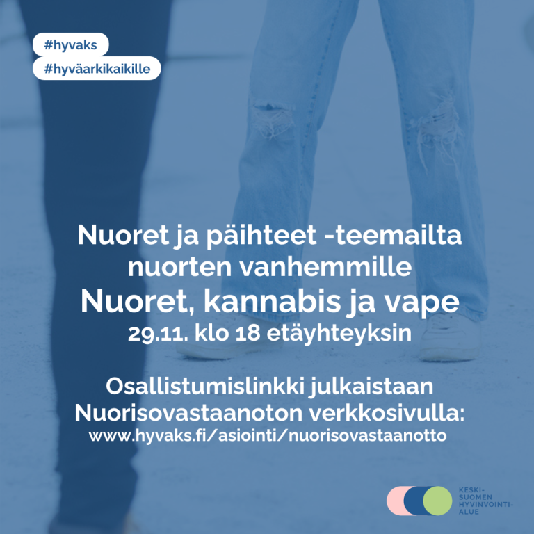 Keski-Suomen hyvinvointialue järjestää keskiviikkona 29.11. Klo 18–19.30 vanhemmille suunnatun Nuoret ja päihteet -teemaillan, jossa keskustellaan sähkötupakasta ja kannabiksesta. Teams-etäyhteydellä järjestettävään tilaisuuteen on vapaa pääsy.