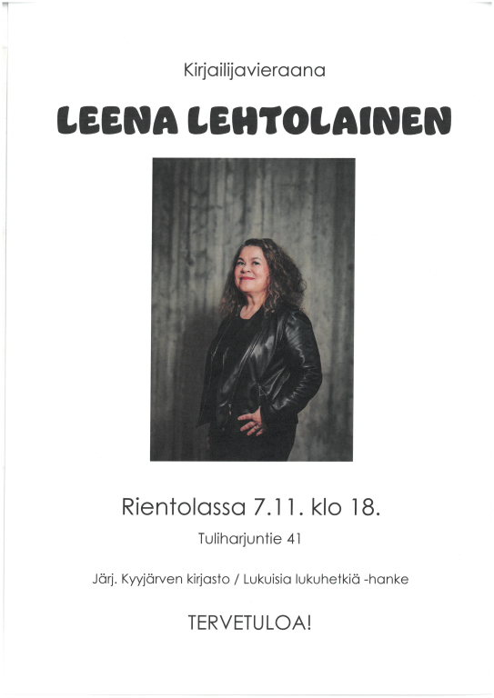 Lukuisia lukuhetkiä -hanke ja kirjasto järjestävät Leena Lehtolaisen kirjailijavierailulle Kyyjärvelle tiistaina 7.11. Tilaisuuden paikkana on poikkeuksellisesti Rientola.
