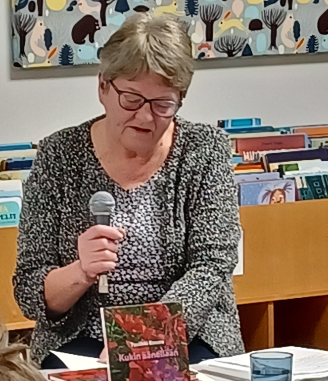 Toisena kirjailijavieraana oli Tuulikki Rauma, jonka runokirjan julkistamistilaisuus pidettiin kirjastossa. Myös tämä ilta aloitettiin kahvilla ja pullalla, jonka jälkeen siirryttiin kuuntelemaan Tuulikin ajatuksia runojen kirjoittamisesta. Saatiinpa kuulla muutama runokin tästä uudesta Kukin äänellään -kirjasta itsensä runoilijan lausumana. Ja yleisö osallistui taas hienosti keskusteluun. Oikein mukava ja lämminhenkinen tilaisuus!