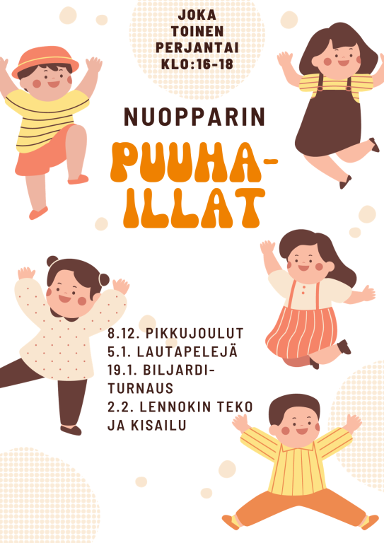 Lapset ja nuoret 30.11.2023 Karstulan-Kyyjärven 4H-yhdistys ry Päivi Heinonen Puuha-illat jatkuvat... Nuopparin puuha-illat jatkuvat joka toinen perjantai. Nyt ohjelmassa pikku-joulut, lautapelikerta, biljarditurnaus ja lennokin teko ja niillä kisailu. Jaa sosiaalisessa mediassa Aihealueen yhteistyöyritykset