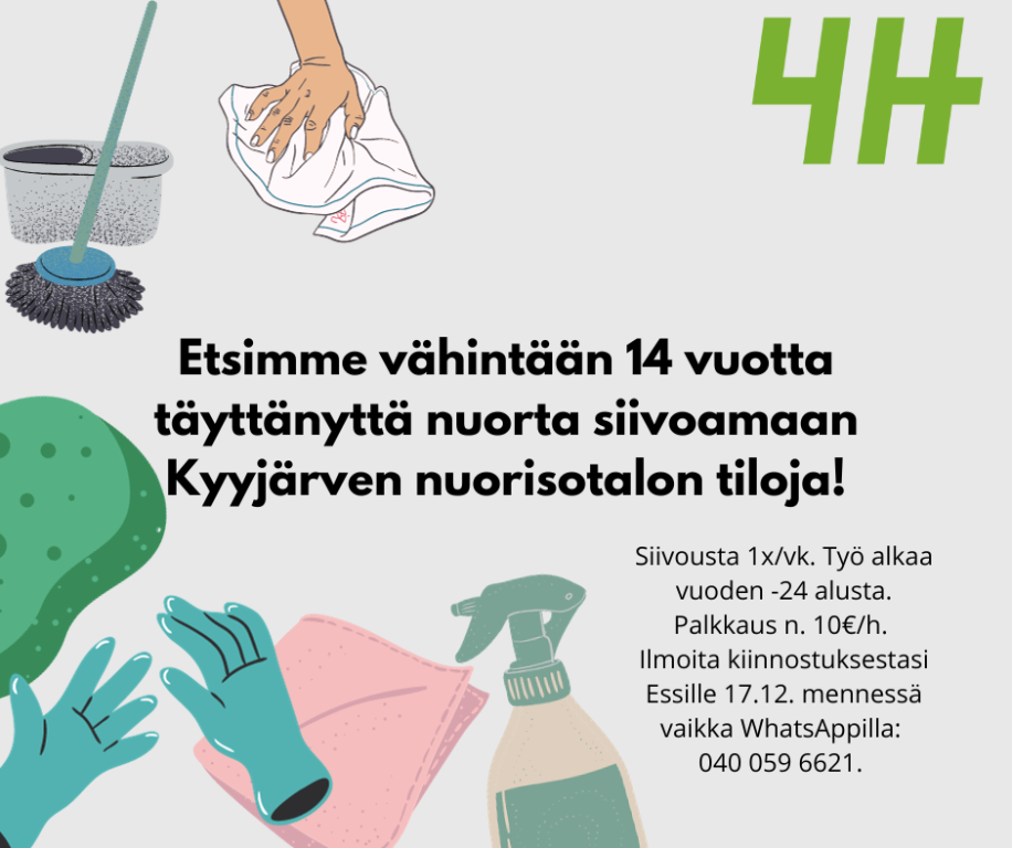 Karstula-Kyyjärven 4H-yhdistys etsii vähintään 14-vuotiasta työntekijää siivoamaan Kyyjärven nuorisotaloa!