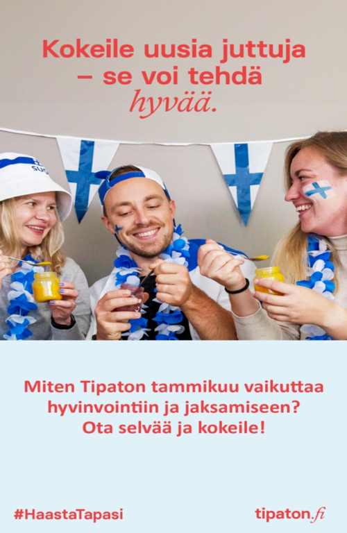 Ehkäisevän päihdetyön järjestöverkosto sivuilta voit lukea lisää Tipaton tammikuu - kampanjasta. Sieltä löytyy mm. artikkeleja, vaikuttajien haastatteluja, reseptejä ja alkoholittomia juoma vaihtoehtoja erilaisiin tilanteisiin tai voit testata omaa tietouttasi.