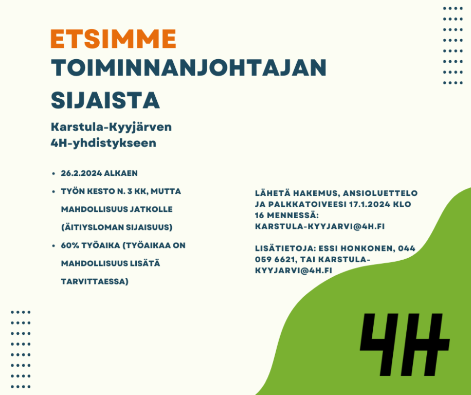 Lisätietoja tehtävästä antaa Essi Honkonen: 044 059 6621 tai karstula-kyyjarvi(at)4h.fi
