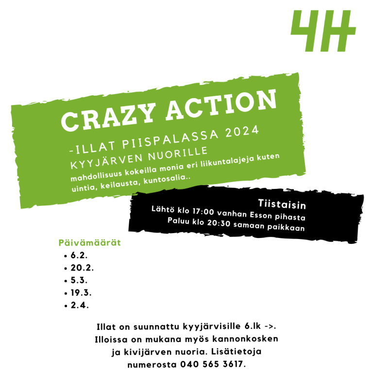 Lisätietoja Crazy action -illoista Päiviltä 040 565 3617 tai Essiltä 044 059 6621.